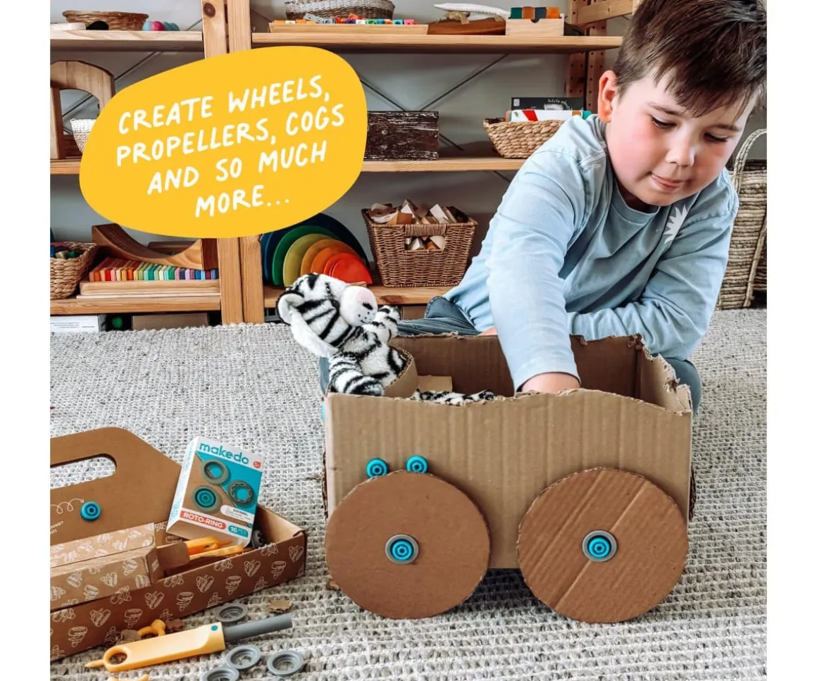 Con los rodamientos de Makedo podrás darle movimiento a todas tus creaciones. Desde ruedas a un camión, hélices para tu helicóptero, hacer girar un molino y mucho más.