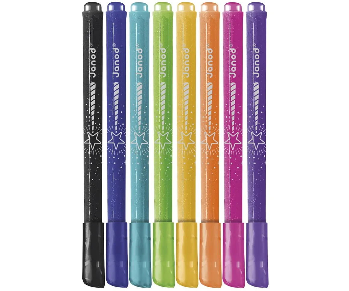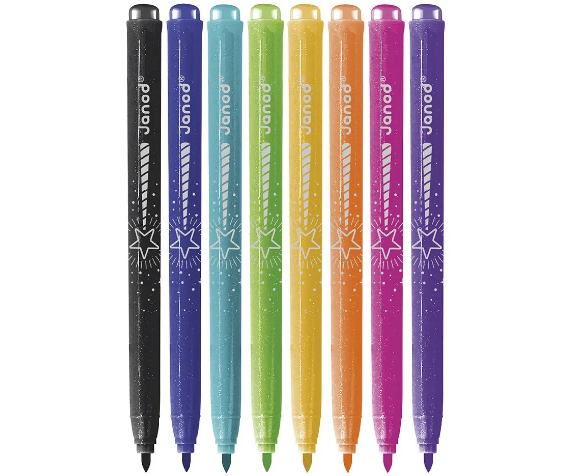Pack de 8 rotuladores de colores con purpurina Janod con punta fina, para que los peques disfruten de sus dibujos.