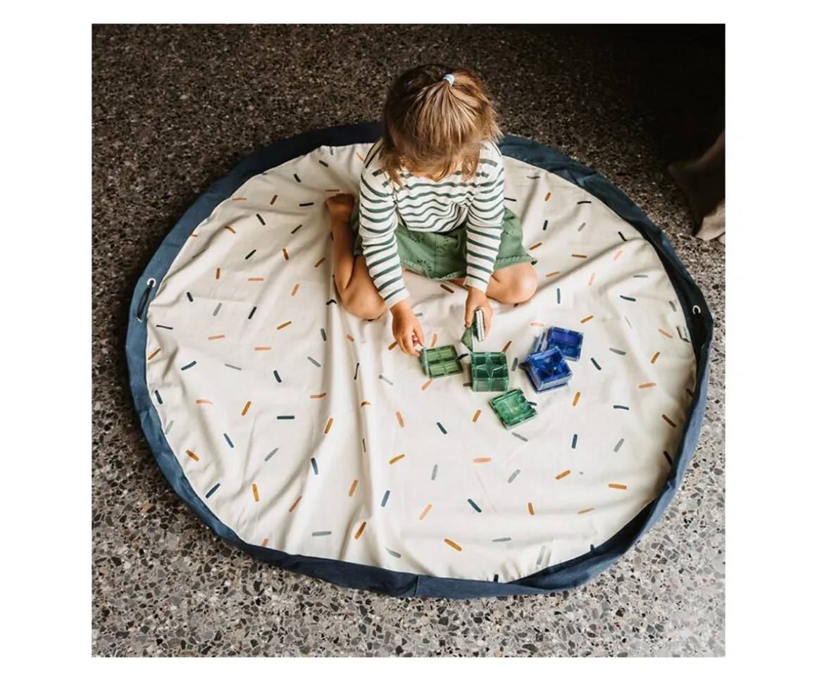 Este saco se desdobla y se convierte en una manta de juegos donde el niño puede jugar con todas sus juguetes, grandes y pequeños, y cuando llega la hora de acostarse, sólo hay que cerrarla y ya está todo recogido.