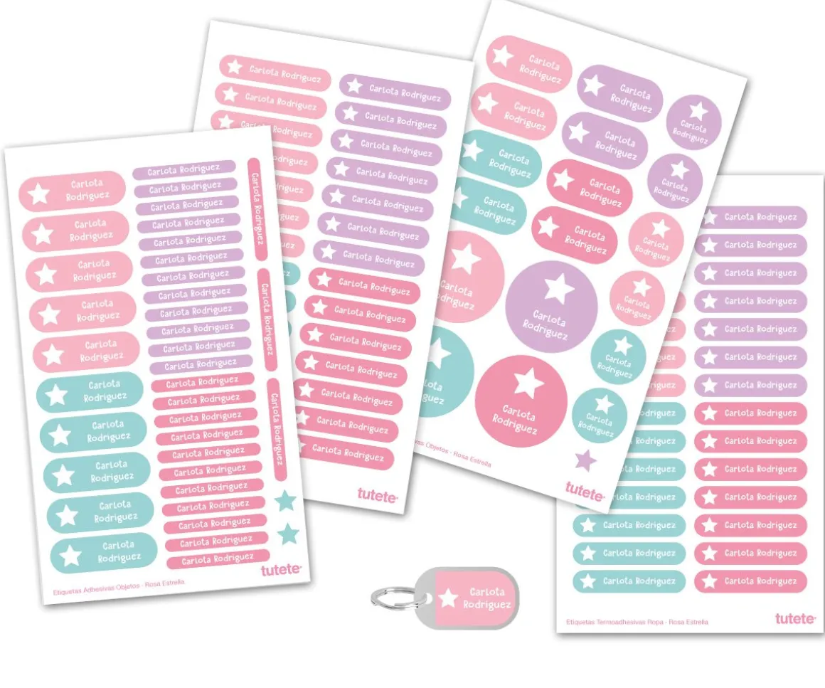 Tutete trae este pack súper práctico formado por un Sello Personalizado Gran Estrella con el nombre de tu peque y el pack Combinado Termo y Pegatinas Rosa Estrella.