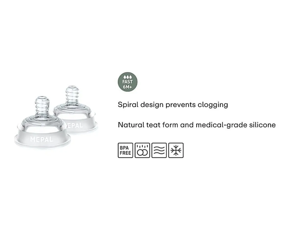 Set de 2 tetinas transparentes para los biberones Mio de Mepal. Podrás tener repuestos y así poder reutilizar el biberón. La tetina está especialmente diseñado para evitar cólicos y su tetina tiene diseño en espiral para prevenir el bloqueo.