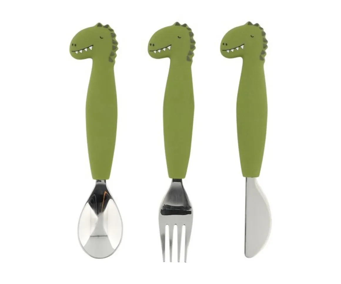 Set de 3 cubiertos de silicona de la colección Mr. Dino de Trixie para comer, ideales para alimentar a tu bebé.