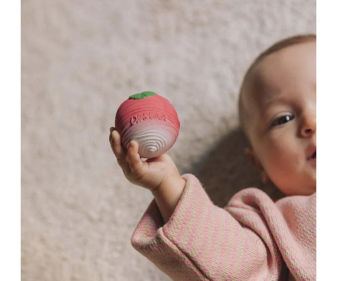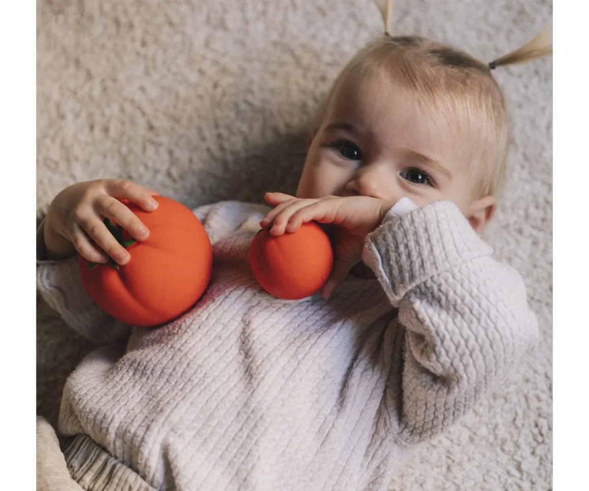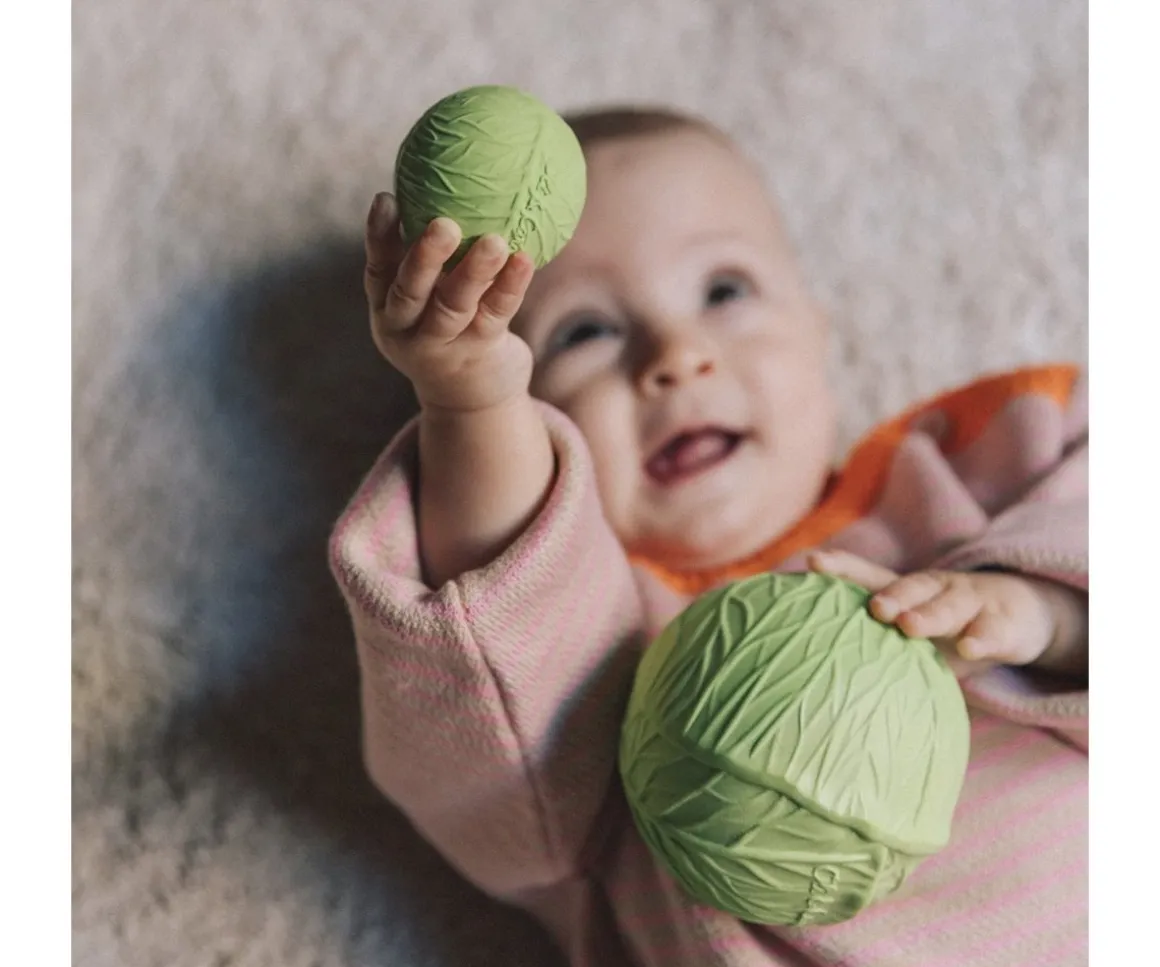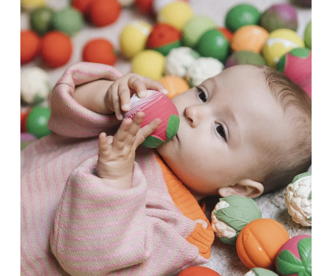 Set de 3 mini pelotas para que los bebés aprendan hábitos saludables y potencien su desarrollo sensorial. Este set Veggie Salad de Oli&Carol, cumple la función de mordedor, pelota sensorial y juguete de baño, fabricados en caucho 100% natural de árboles Hevea.