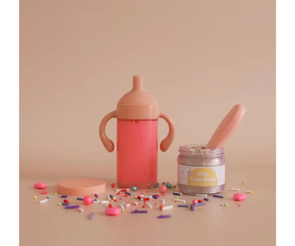Tiny Harlow trae la vajilla perfecta para la fiesta de cumpleaños de tus muñecas. El set incluye un primer vasito con asas y un tarrito de comida para muñecas con sabor a pastel de cumpleaños.