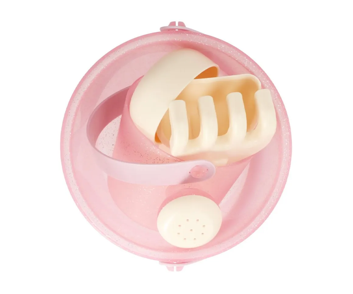 Compuesto por 5 piezas y fabricado en un material muy resistente. El cubo de playa y la regadera son de púrpurina rosa translúcida.