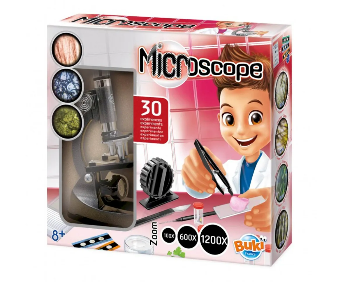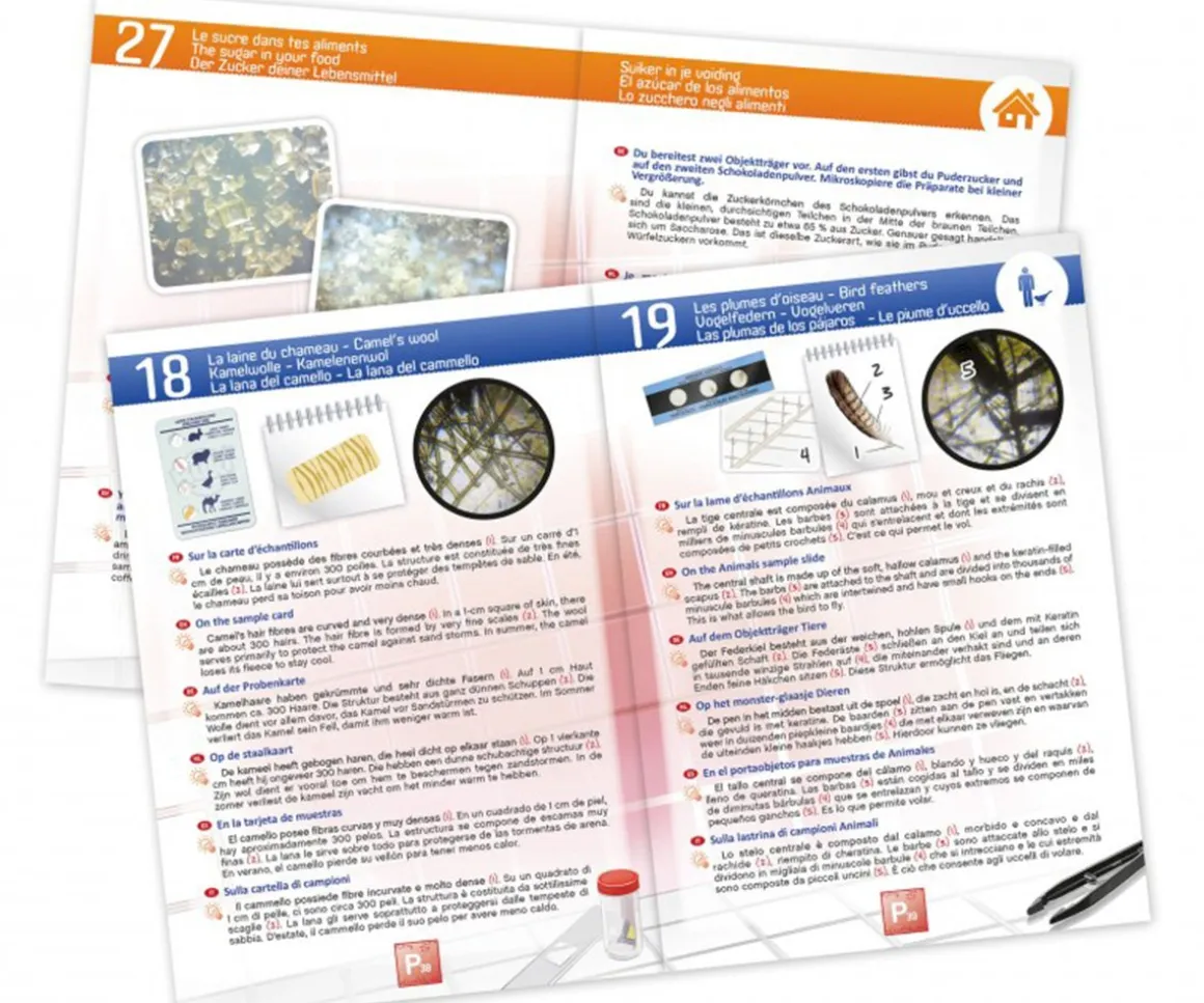 - Incluye: microscopio (ocular, rueda de rotación de enfoque), base, luz de fondo, platina con pinzas, 1 tarjeta de muestra, 3 portaobjetos de muestra, 12 portaobjetos en blanco, 1 placa de Petri, 1 microcortador, 1 aguja, 1 bisturí, 1 par de pinzas. , 3 frascos pequeños, 2 frascos grandes, 12 cubreobjetos y 12 etiquetas, hoja de instrucciones en color