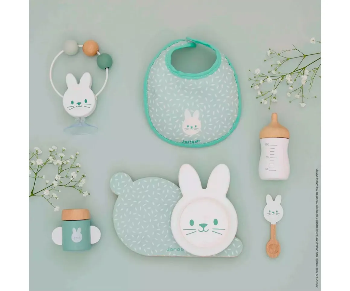 - Incluye: 1 bandeja,1 conejo sonajero,1 plato, 1 babero con velcro, una cucharita, un vasito con asas, 1 biberón