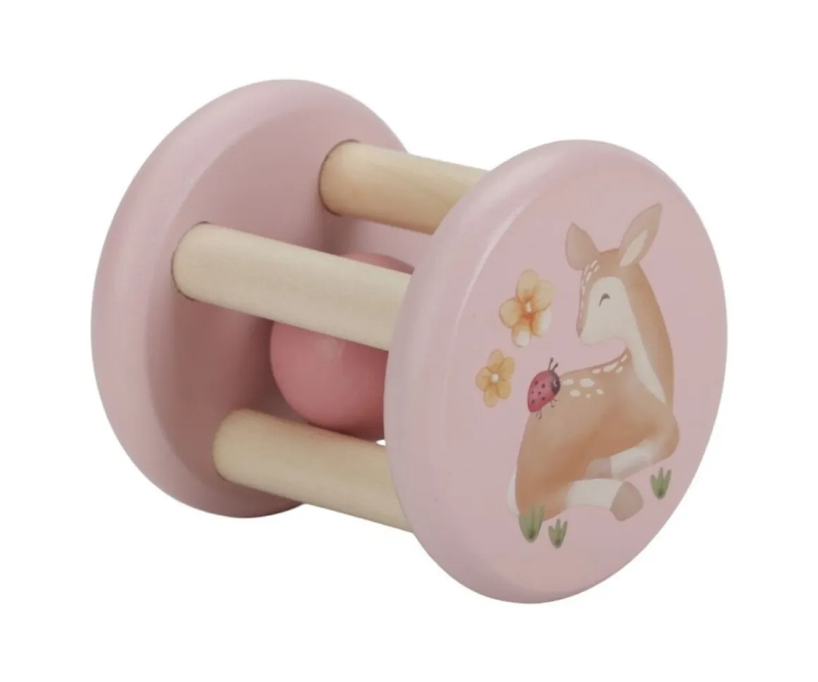 Este adorable sonajero de madera, rueda, haciéndo un sonido de traqueteo a medida que avanza. Sus lados rosas tienen una bonita ilustración de la colección Fairy Garden de Little Dutch.