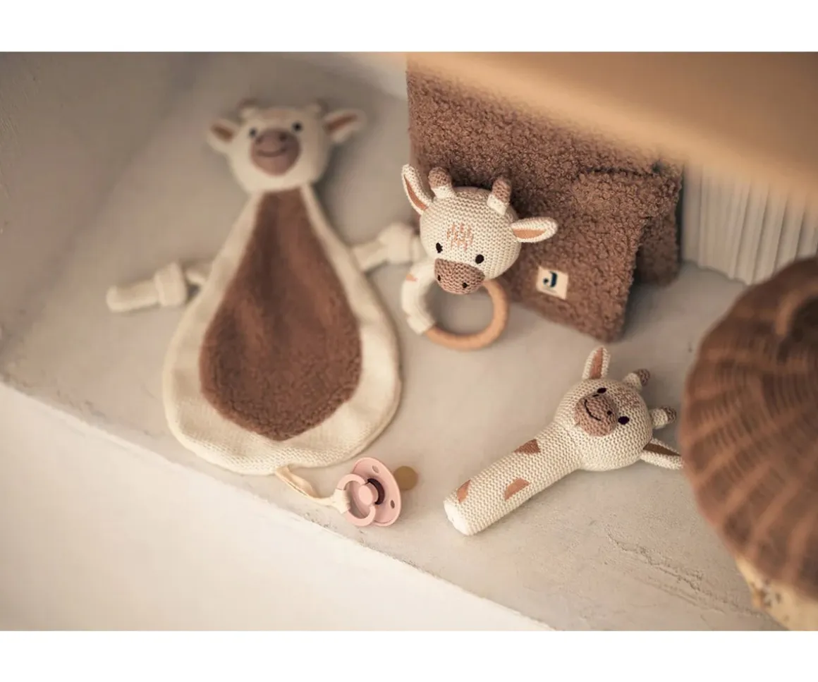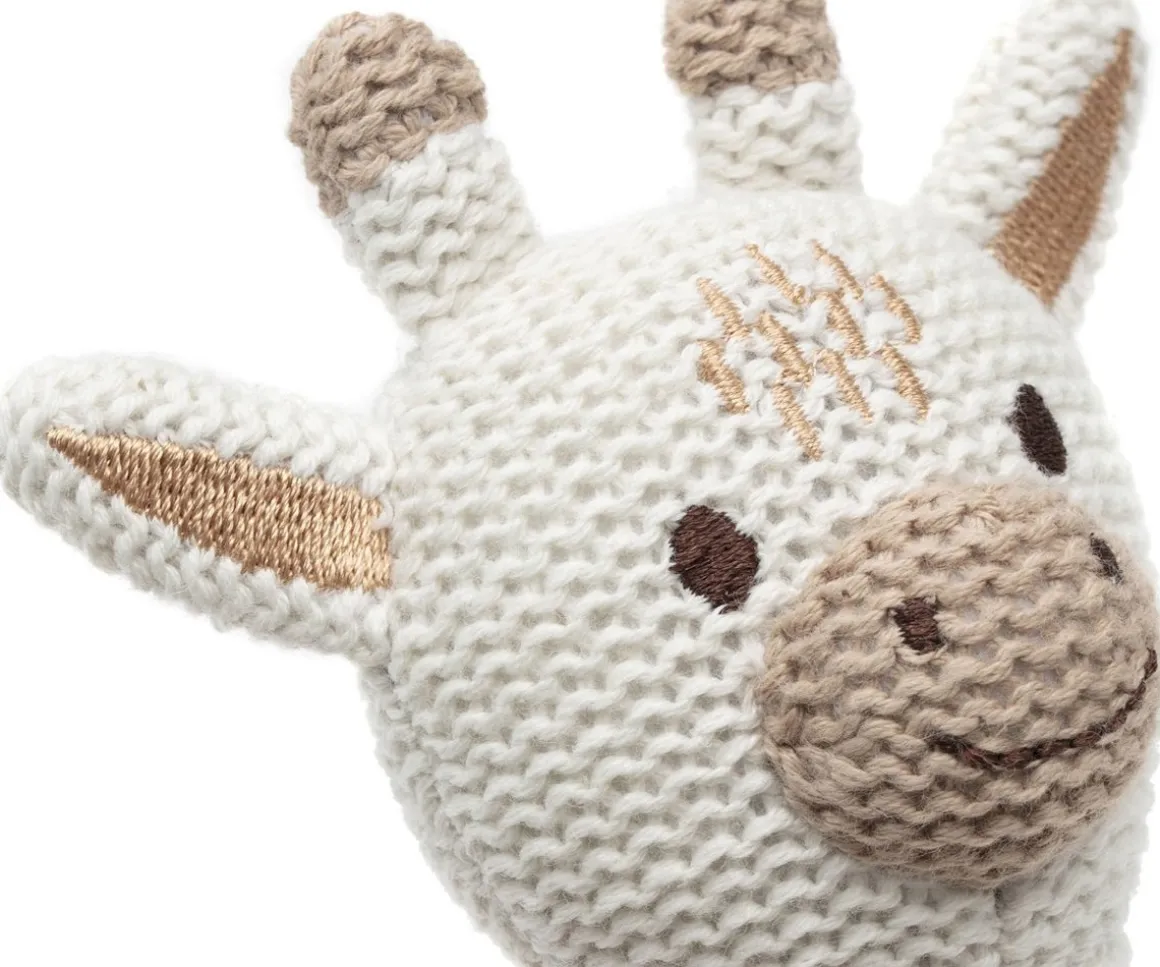 Esta preciosa jirafa confeccionada en punto, cuenta con unas campanitas en su cabeza que suenan al agitarlo. Tiene la forma y el tamaño perfecto para que los peques puedan manejarlo con facilidad.