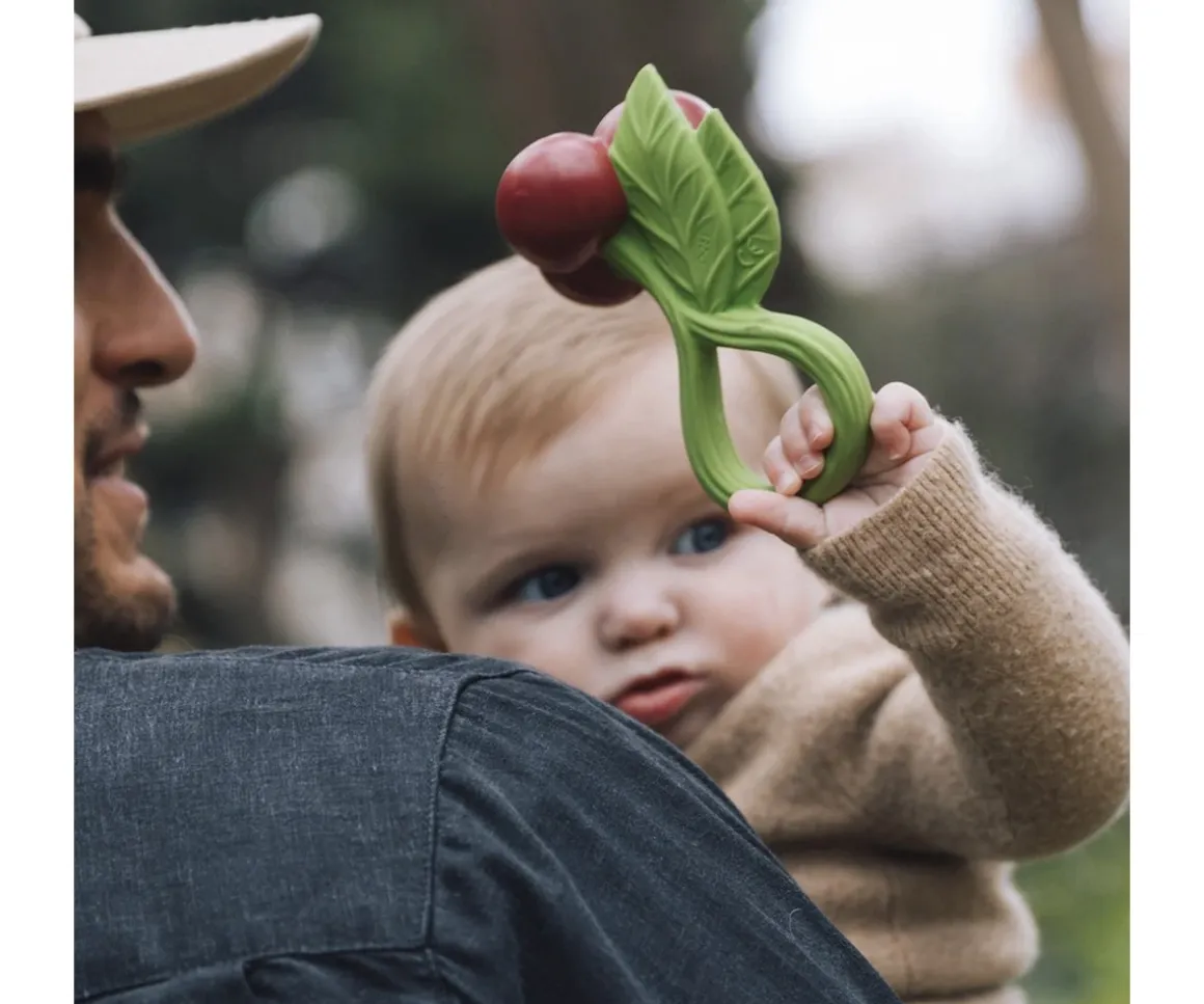 Sonajero Cherry de Oli & Carol fabricado de caucho 100% natural y en su interior hay semillas de cereza recicladas que convierten este mordedor en un sonajero. ¡2 en 1!