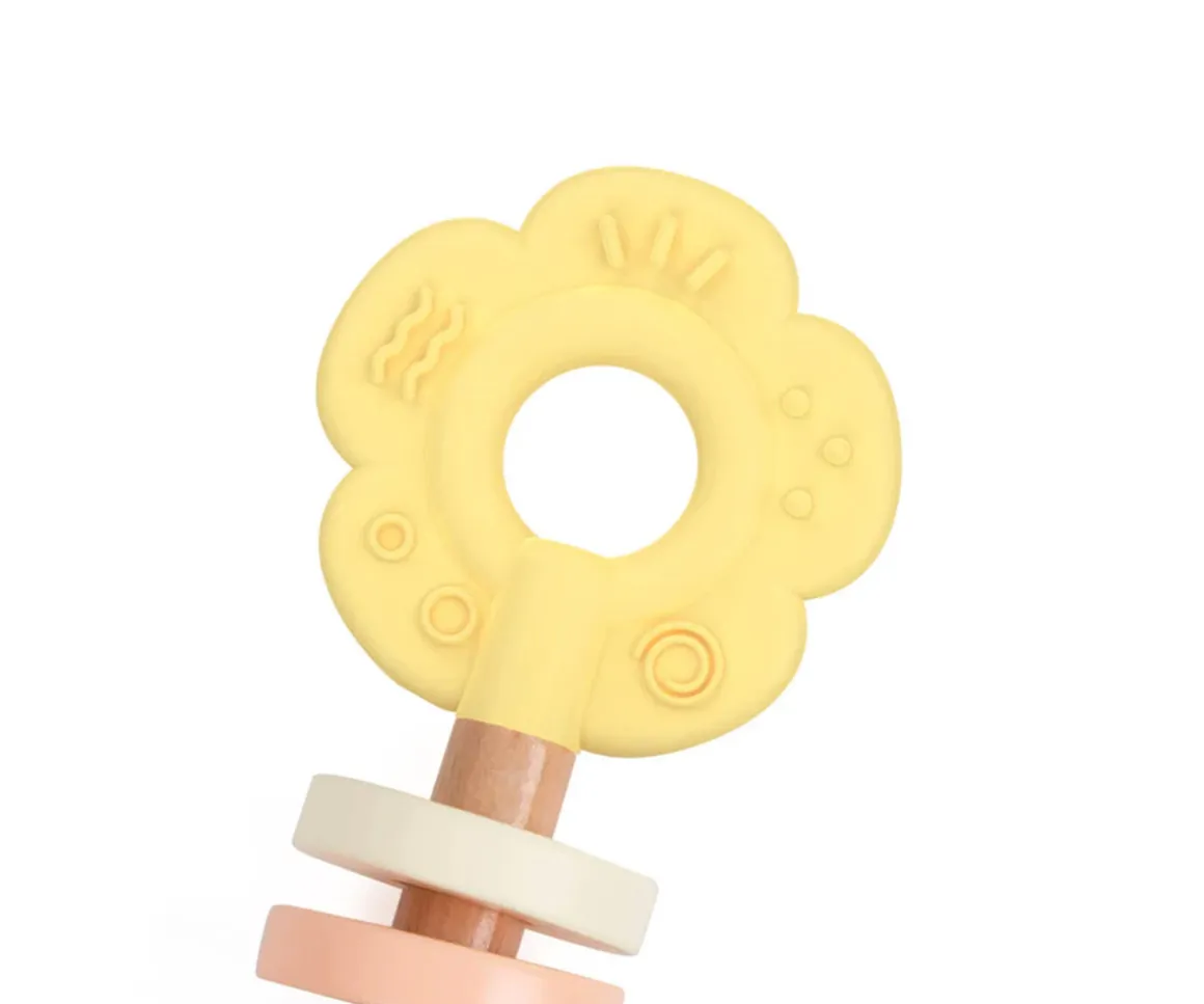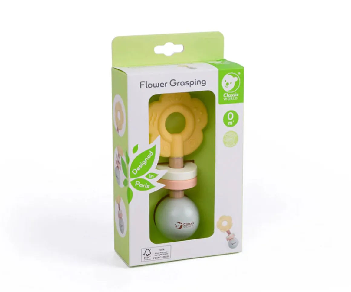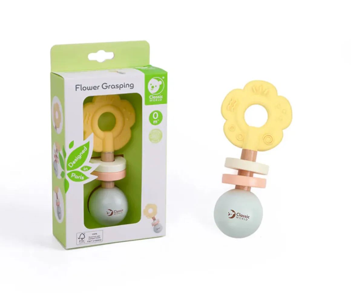 Este precioso sonajero-mordedor con forma de flor y colores suaves está diseñado para captar la atención de los más pequeños. Su forma es fácil de agarrar con sus manitas, y su sonido delicado estimula sus sentidos.