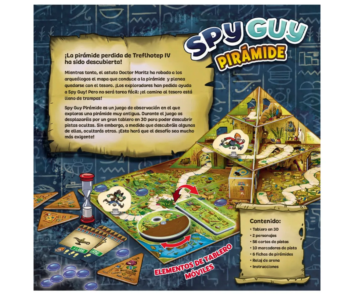 - Incluye: 56 cartas de pistas, tablero 3D, 10 marcadores de pista, 6 fichas de pirámides, reloj de arena, 2 personajes e instrucciones