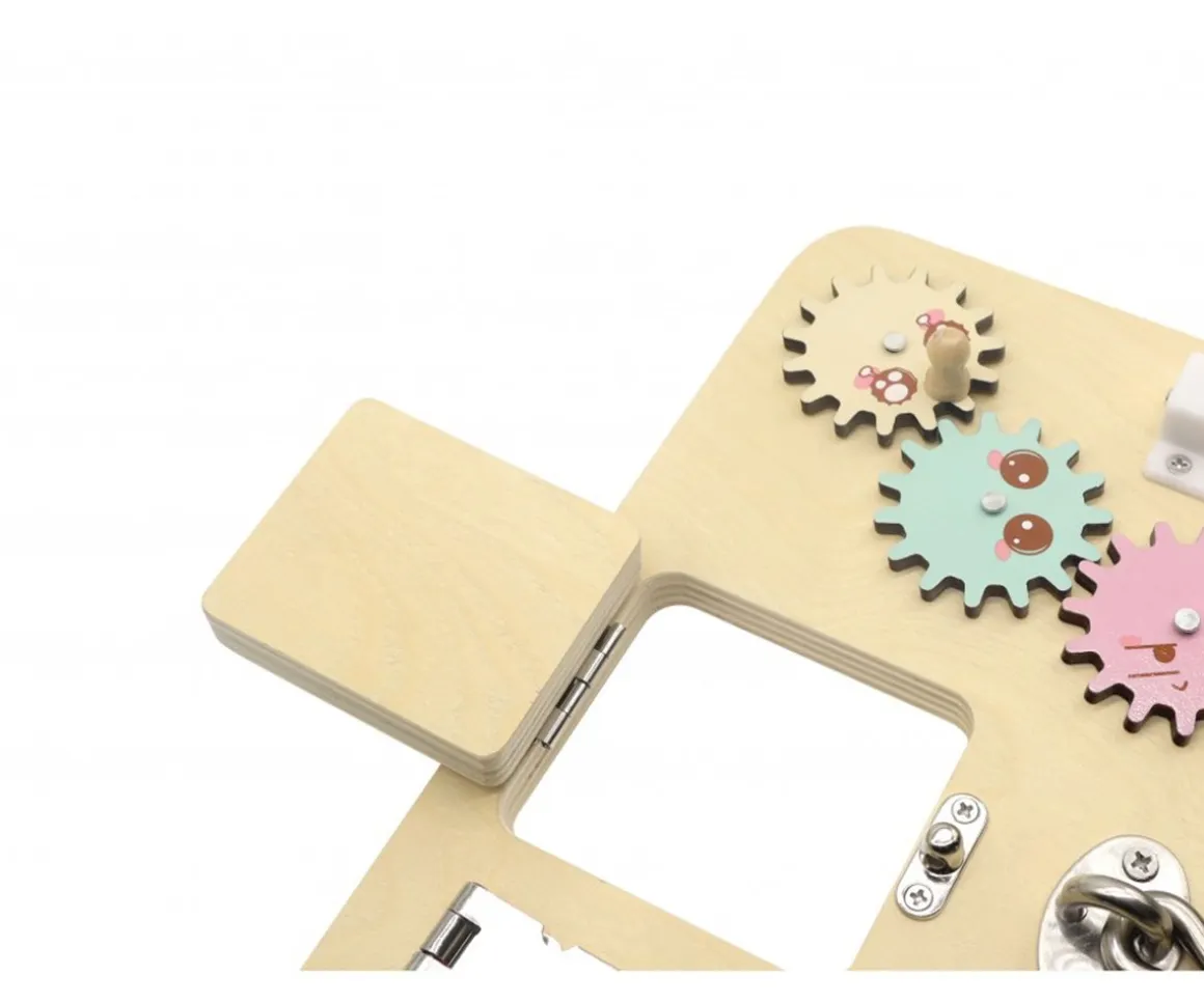 Tablero de actividades de madera para trabajar la motricidad y coordinación con las diferentes formas y cierres de pestillo y fijación.