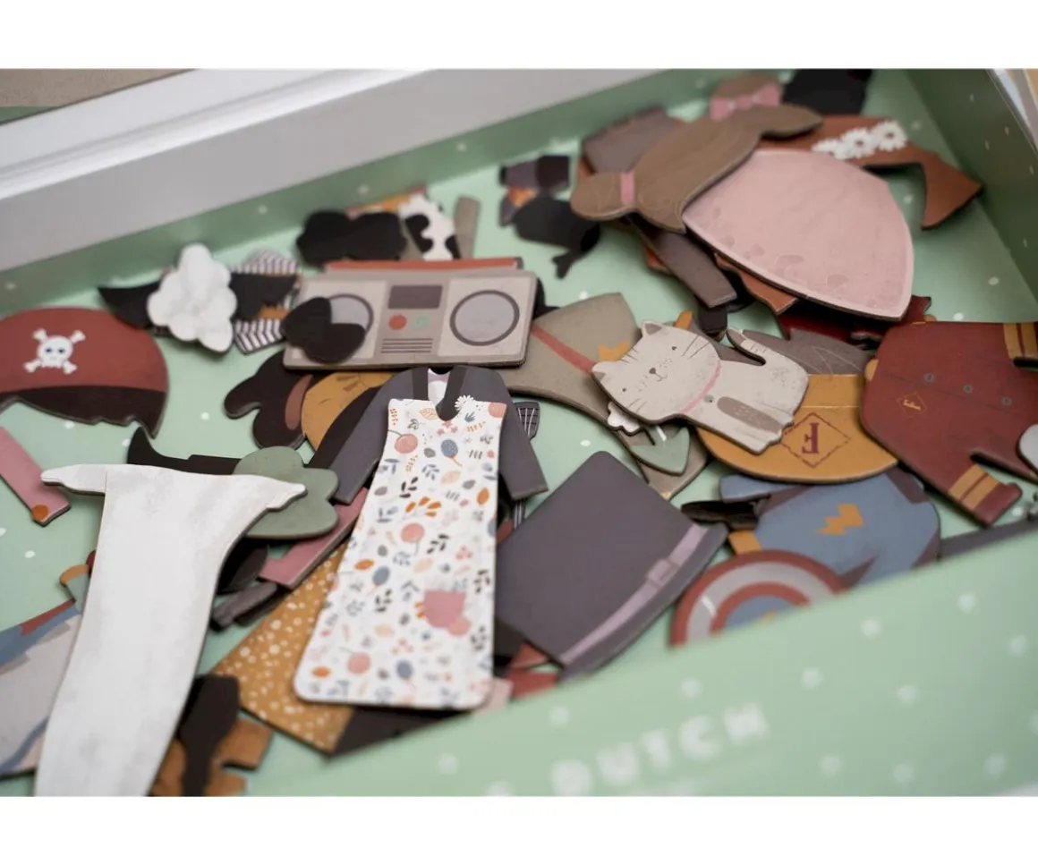 ¡Juega a disfrazarte con Jim & Rosa! Con este puzzle magnético puedes copiar los atuendos de las cartas en el tablero con piezas magnéticas. O usar tu propia imaginación. Hay un sinfín de combinaciones que garantizan mucha diversión mientras fomentan el vocabulario y la coordinación. Es perfecto para jugar en casa, pero también de viaje.