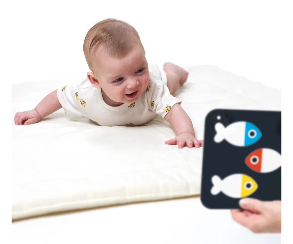 Estas tarjetas de grandes ilustraciones con alto contraste estimularán los sentidos de los bébés y fomentarán la interconexión con los padres.