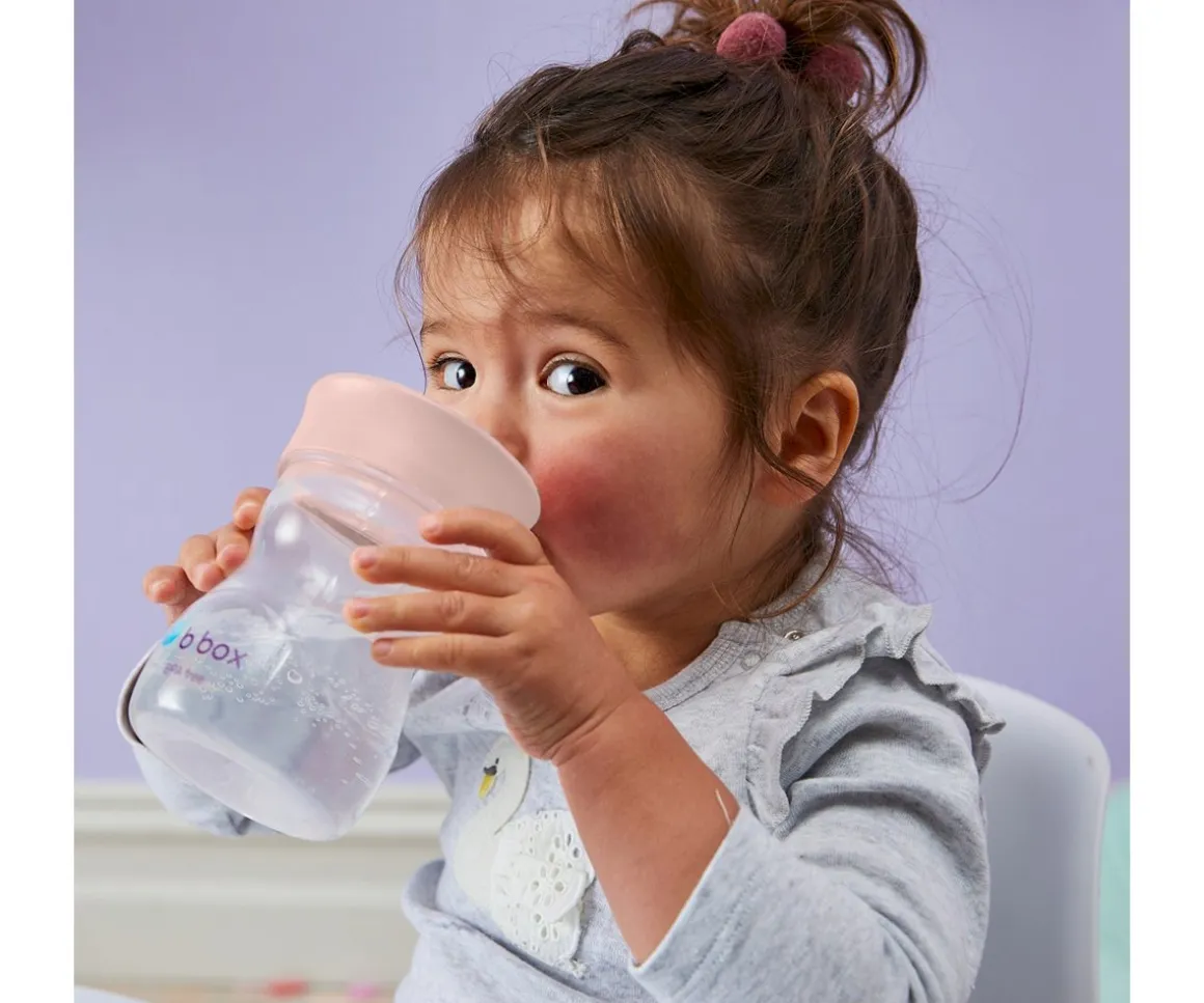 La taza con borde de entrenamiento de B.Box imita el flujo de un vaso de mayores, ya que canaliza el líquido hacia el borde para que los peques beban fácilmente.