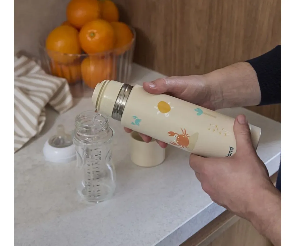 Este termo de acero inoxidable Thermy de la colección Crabsy de Miniland, mantendrá los líquidos fríos o calientes durante mucho tiempo, gracias a su innovadora triple capa aislante, para que puedas preparar el bibierón de tu peque en cualquier parte.