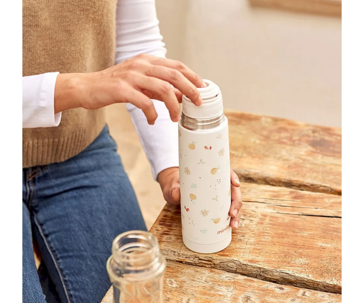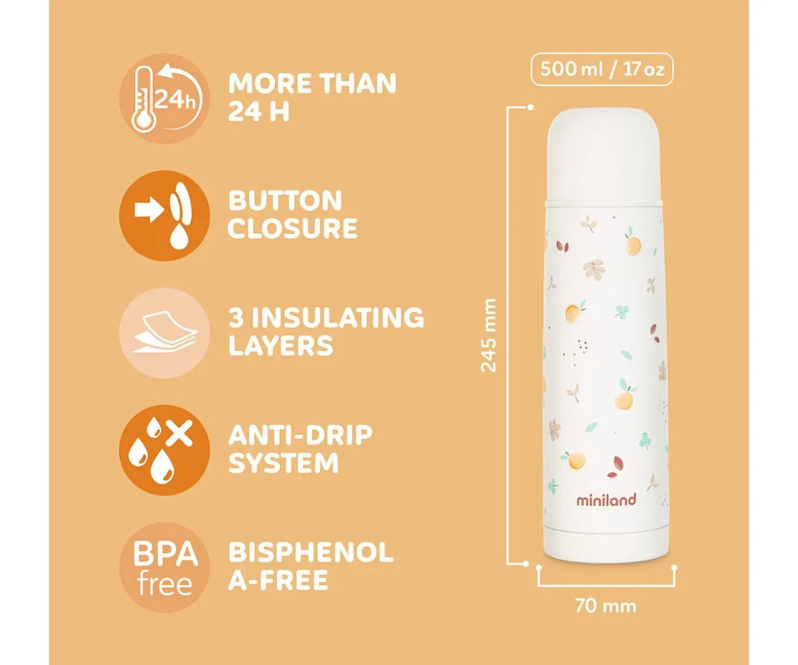 Este termo de acero inoxidable Thermy de la colección Valencia de Miniland,mantendrá los líquidos fríos o calientes durante mucho tiempo,gracias a su innovadora triple capa aislante, para que puedas preparar el bibierón de tu peque en cualquier parte.
