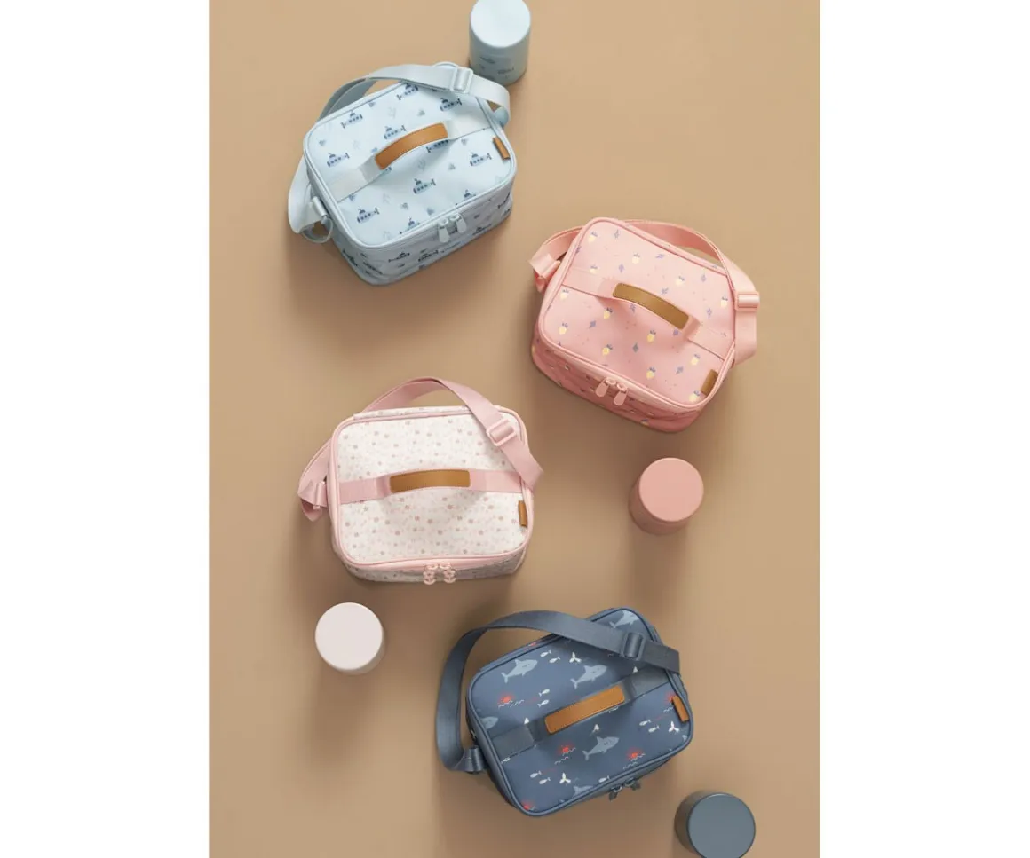 Termo con estampado de tiburones de la marca Fresk con el que los alimentos sólidos o purés a cualquier parte manteniendo su temperatura idónea durante más tiempo.