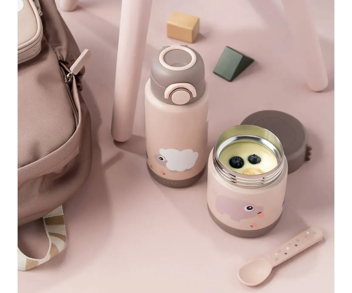 El termo para alimentos sólidos o purés de Done by Deer es de acero inoxidable y mantiene la comida caliente o fría hasta por 6 horas, con un cambio gradual de temperatura con el tiempo.