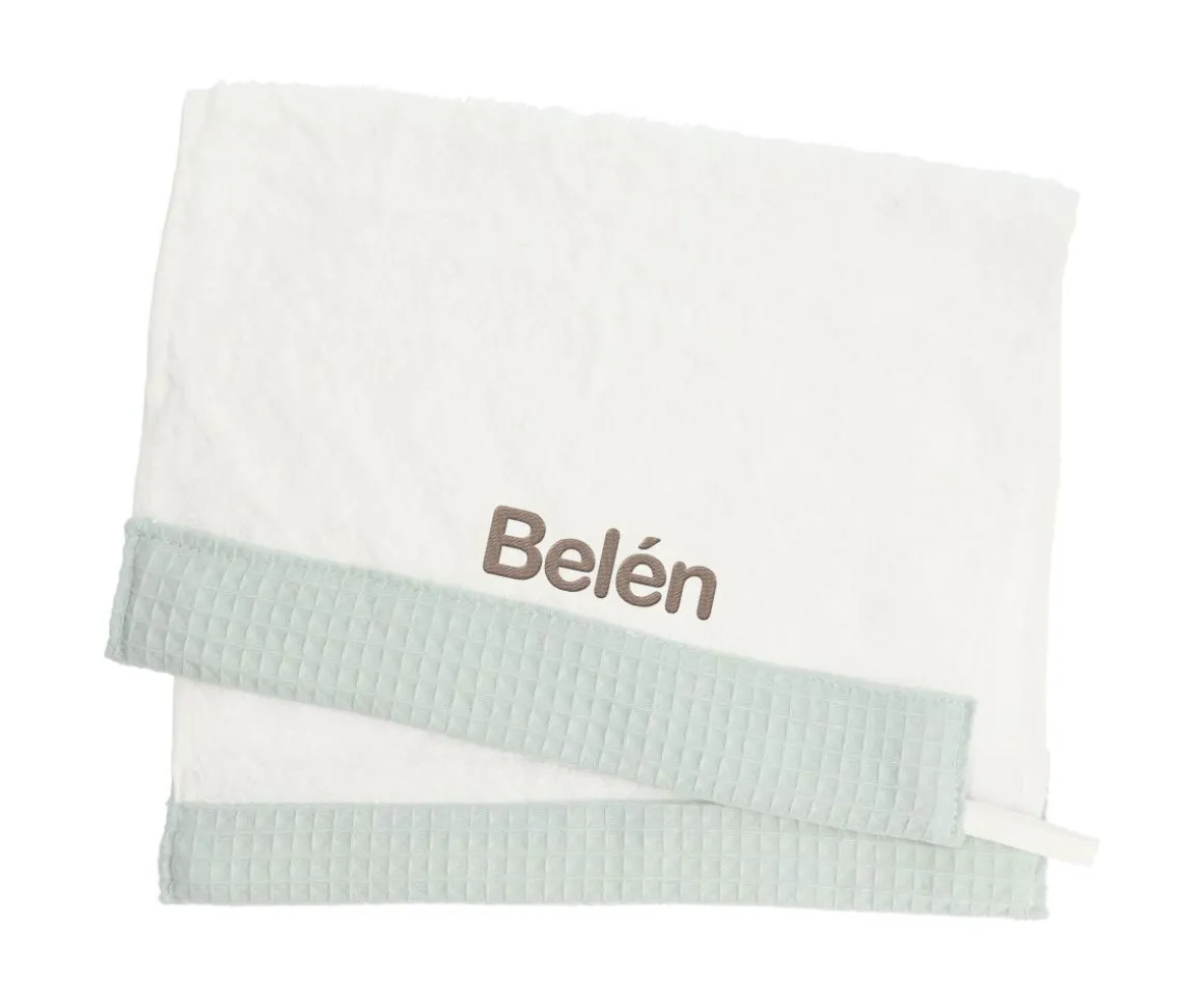 Es muy elegante y puede personalizarse en la parte central justo encima del ribete. Quedándo el nombre del peque perfectamente combinado con el color del dibujo.