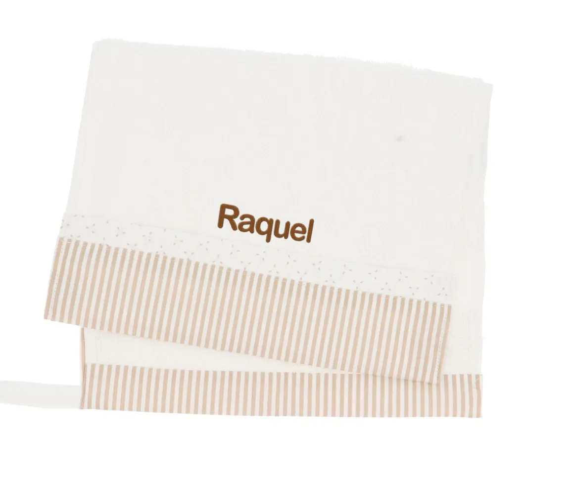 Pequeña toalla para llevar al cole o a la escuela infantil. Es muy elegante y se puede personalizar justo encima del ribete. Además, incluye una pequeña cinta para poder colgar en la percha.