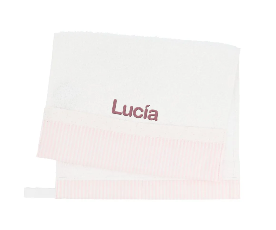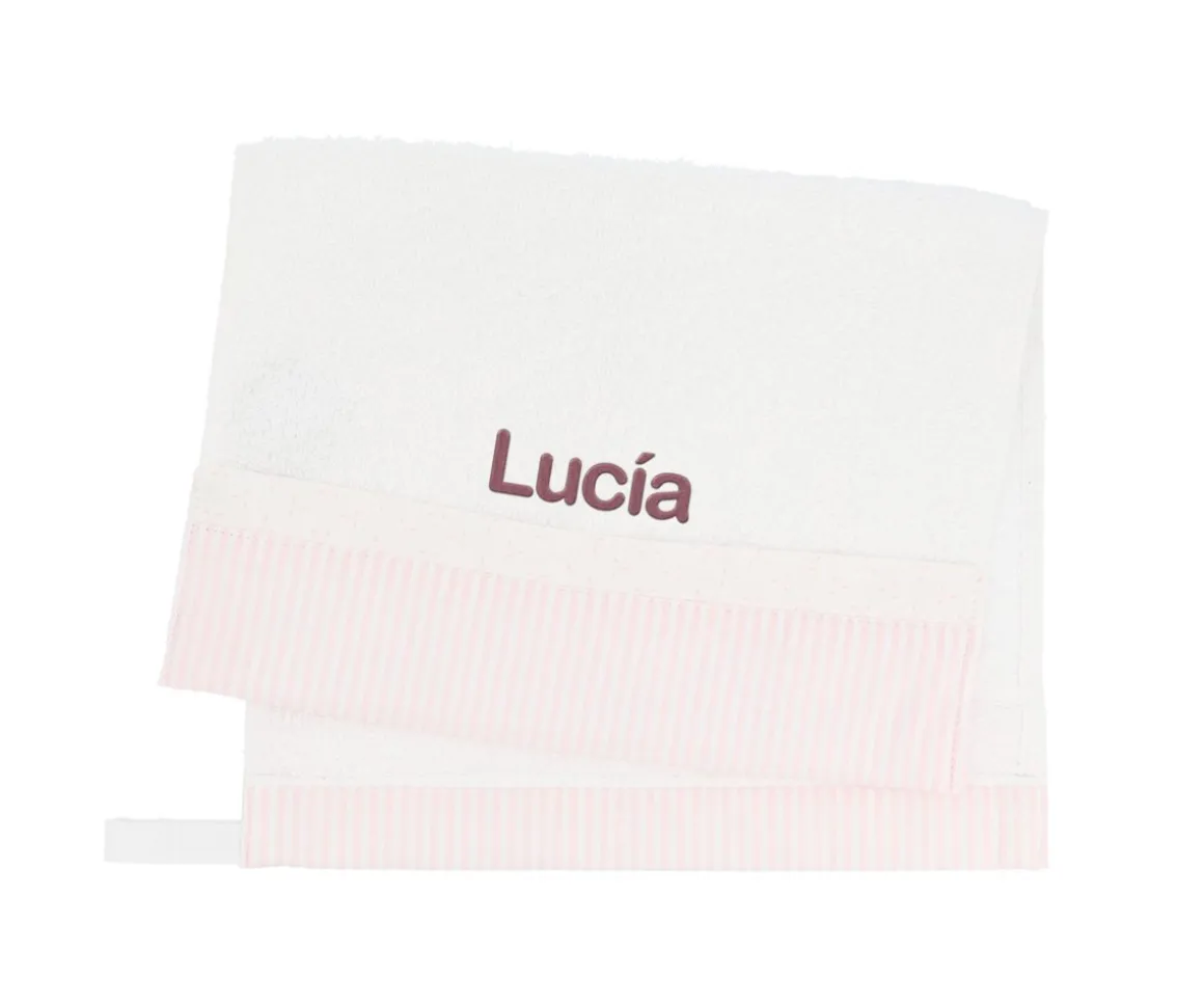 Pequeña toalla para llevar al cole o a la escuela infantil. Es muy elegante y se puede personalizar justo encima del ribete. Además, incluye una pequeña cinta para poder colgar en la percha.