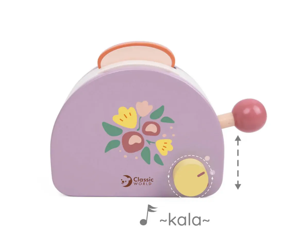 Con este tostador, niños y niñas pueden aprender la importancia de una alimentación equilibrada mientras se divierten imitando rutinas del día a día.Además la manivela lateral se puede mover de arriba a abajo.