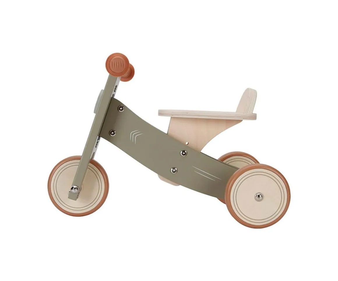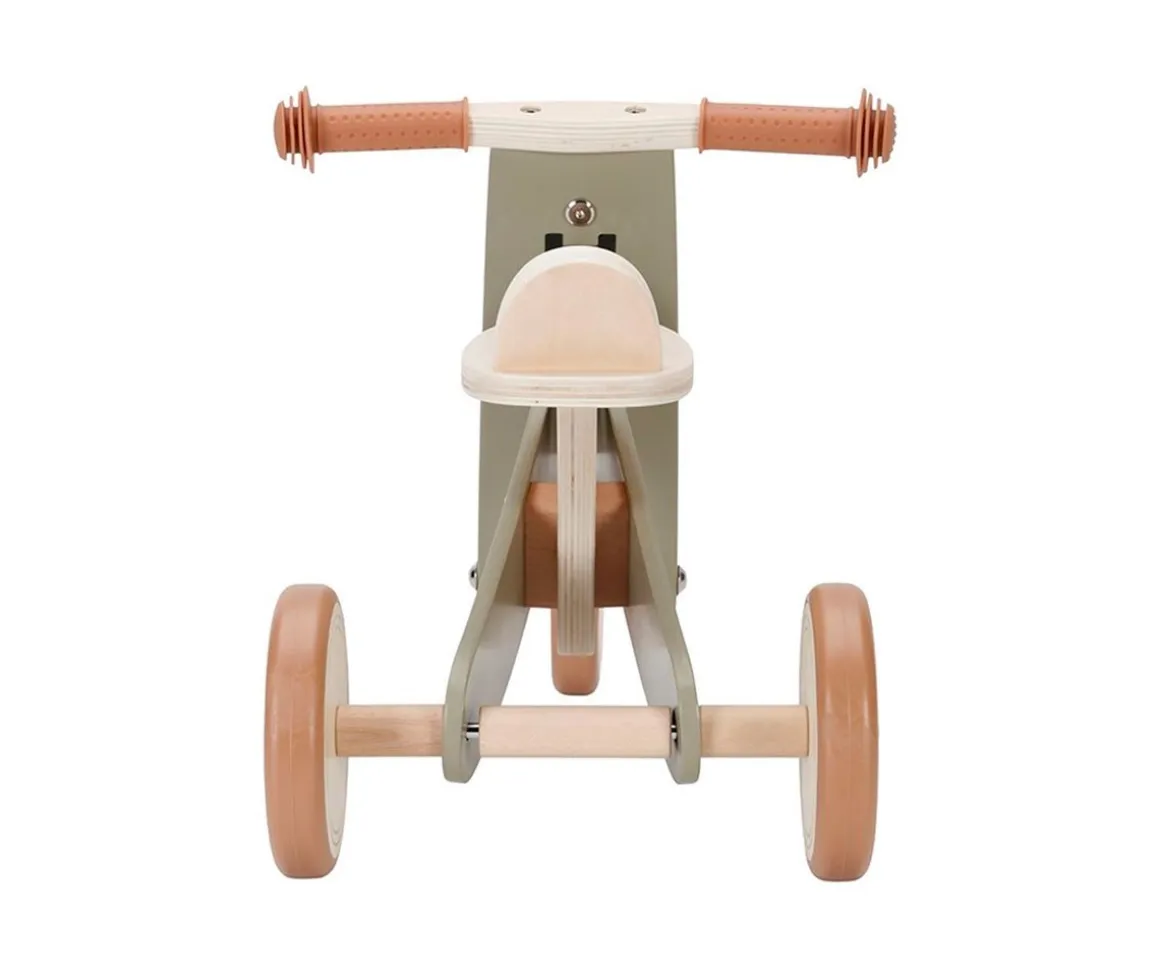 Triciclo de madera para jugar y desarrollar la motricidad y el equilibrio de los peques a partir de 12 meses de edad. Tiene un asiento resistente para brindar comodidad y estabilidad, el manillar tiene dos asas de goma para un buen agarre y las ruedas cuentan con borde de goma.