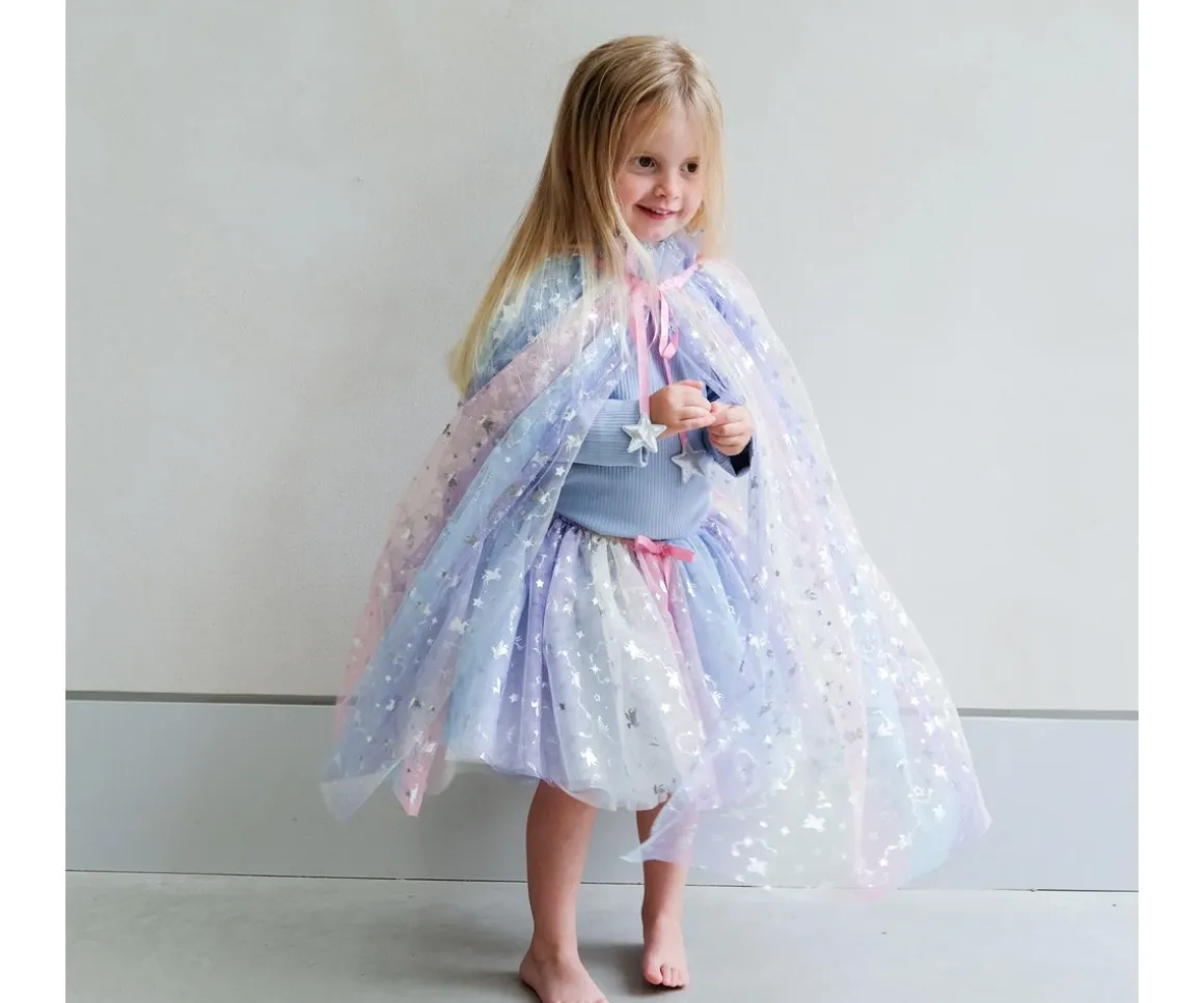 Este precioso tutú de tul en tonos pastel degradados, está decorado con pequeñas motas de estrellas plateadas y unicornios, ¡un disfraz auténtico en el que tu peque brillará!