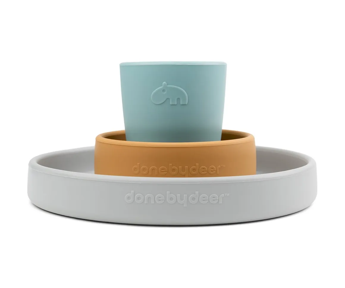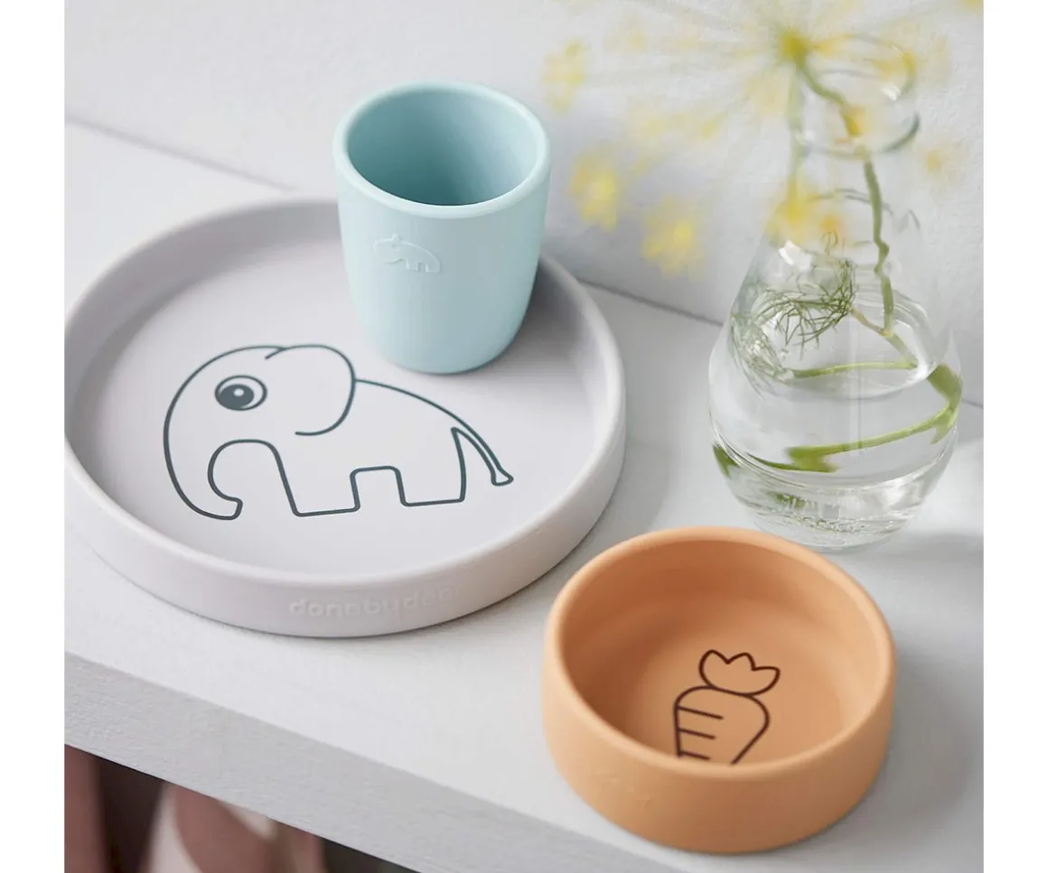 Esta vajilla de 3 piezas hará que cualquier hora de la comida sea divertida acompañados por los animales que podrán encontrar en ella, un plato Elphee gris, un bol zanahoria mostaza y una minitaza azul claro