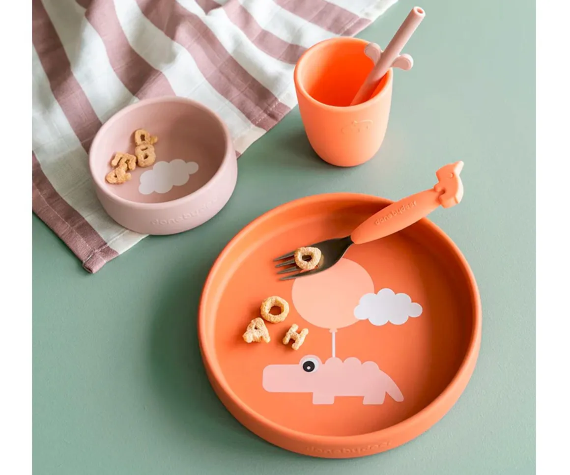 Esta vajilla de 3 piezas hará que cualquier hora de la comida sea divertida acompañados por los animales que podrán encontrar en ella, un plato Croco Azul, un bol nube verde y un vasito azul.
